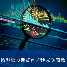 百分秒成交簡檔 期貨百分秒成交簡檔 商品價格 價格: $15,000(元) / 月 格式 範例 選擇權百分秒成交簡檔 商品價格 價格: $15,000(元) / 月 格式 範例 臺股期貨(TX)百分秒成交簡檔 商品價格 價格: $9,000(元) / 月 格式 範例 電子期貨(TE)百分秒成交簡檔 商品價格 價格: $9,000(元) / 月 格式 範例 金融期貨(TF)百分秒成交簡檔 商品價格 價格: $9,000(元) / 月 格式 範例 股票期貨(STF)百分秒成交簡檔 商品價格 價格: $9,000(元) / 月 格式 範例 小型臺股期貨(MTX)百分秒成交簡檔 商品價格 價格: $9,000(元) / 月 格式 範例 微型臺股期貨(TMF)百分秒成交簡檔 商品價格 價格: $9,000(元) / 月 格式 範例 臺指選擇權(TXO)百分秒成交簡檔 商品價格 價格: $9,000(元) / 月 格式 範例 電子選擇權(TEO)百分秒成交簡檔 電子選擇權百分秒成交簡檔 商品價格 價格: $9,000(元) / 月 格式 範例 金融選擇權(TFO)百分秒成交簡檔 商品價格 價格: $9,000(元) / 月 格式 範例 股票選擇權(STC)百分秒成交簡檔 商品價格 價格: $9,000(元) / 月 格式 範例